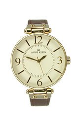 Crisp lines and a modern look define this Women's Gold-Tone Round Brown Leather Strap Watch from AK Anne Klein. The oversized, ivory dial features easy-to-read, gold-tone Arabic numbers at three, six, nine and 12 o'clock with baton indexes marking the remaining hours. A black printed minute track encircles the center of the dial while three gold-tone hands track the time. Unique, gold-tone metal plates with screw details accentuate the slim case and the soft, brown, calfskin leather strap. Designed for the contemporary woman, this chic timepiece will sparkle on your wrist for years to come.
